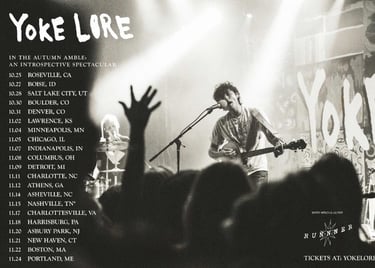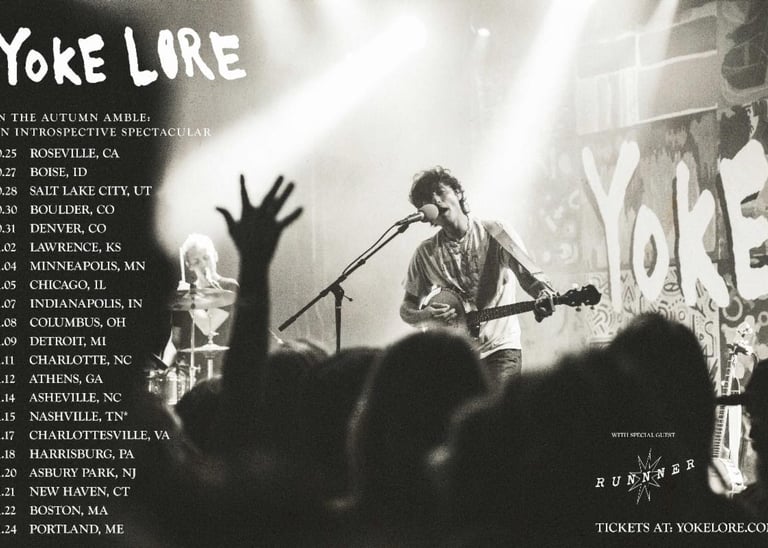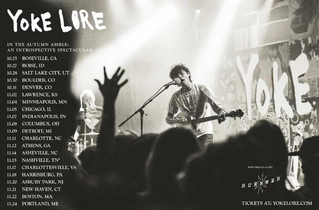 Yoke Lore will embark on "The Autumn Amble: An Introspective Spectacular" tour, starting October 25 at Roseville, CA's Goldfield Trading Post. The tour includes stops at iconic venues like Denver's Ogden Theatre, Minneapolis' First Avenue, and Portland's State Theatre, with support from Runnner. Yoke Lore will also join Briston Maroney at the "Paradise" festival in Nashville on November 15.
